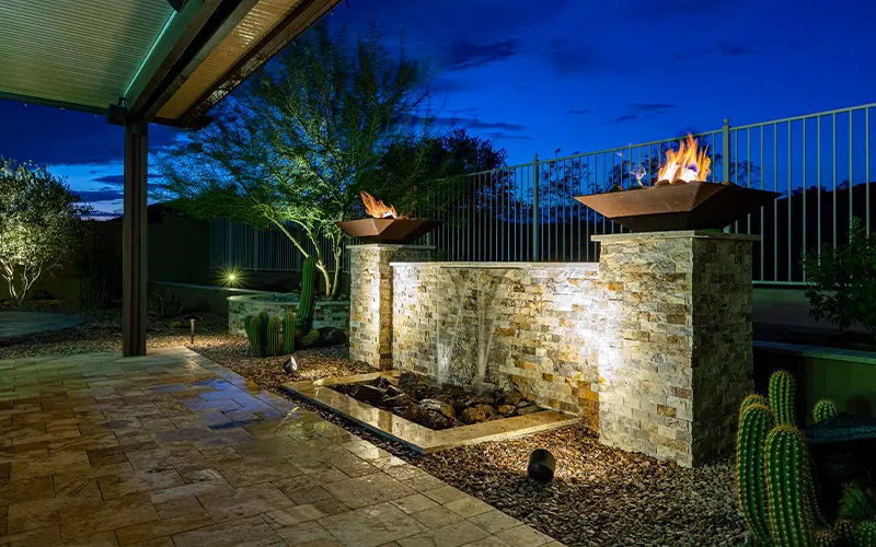 Built-in fire features add warmth, ambiance, and style—perfect for cozy gatherings and year-round outdoor enjoyment in the Arizona desert.